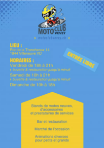 Le Moto Club Vevey vous invite à célébrer la 20ᵉ édition de son Moto Show, du vendredi 27 au dimanche 29 mars 2026, dans et autour de la salle de la Tronchenaz à Villeneuve.